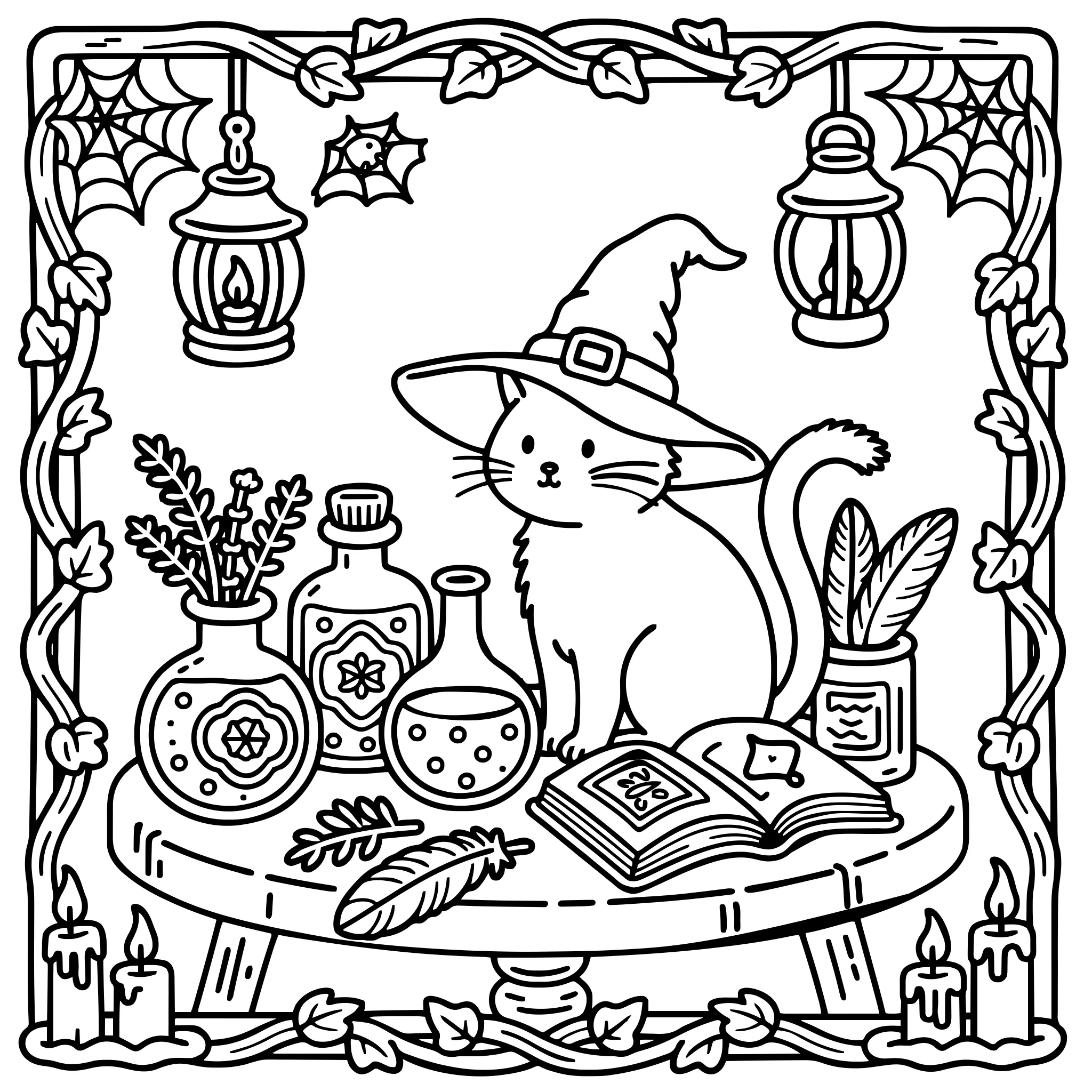 Witch’s cat mixing potions in ornate apothecary setting.