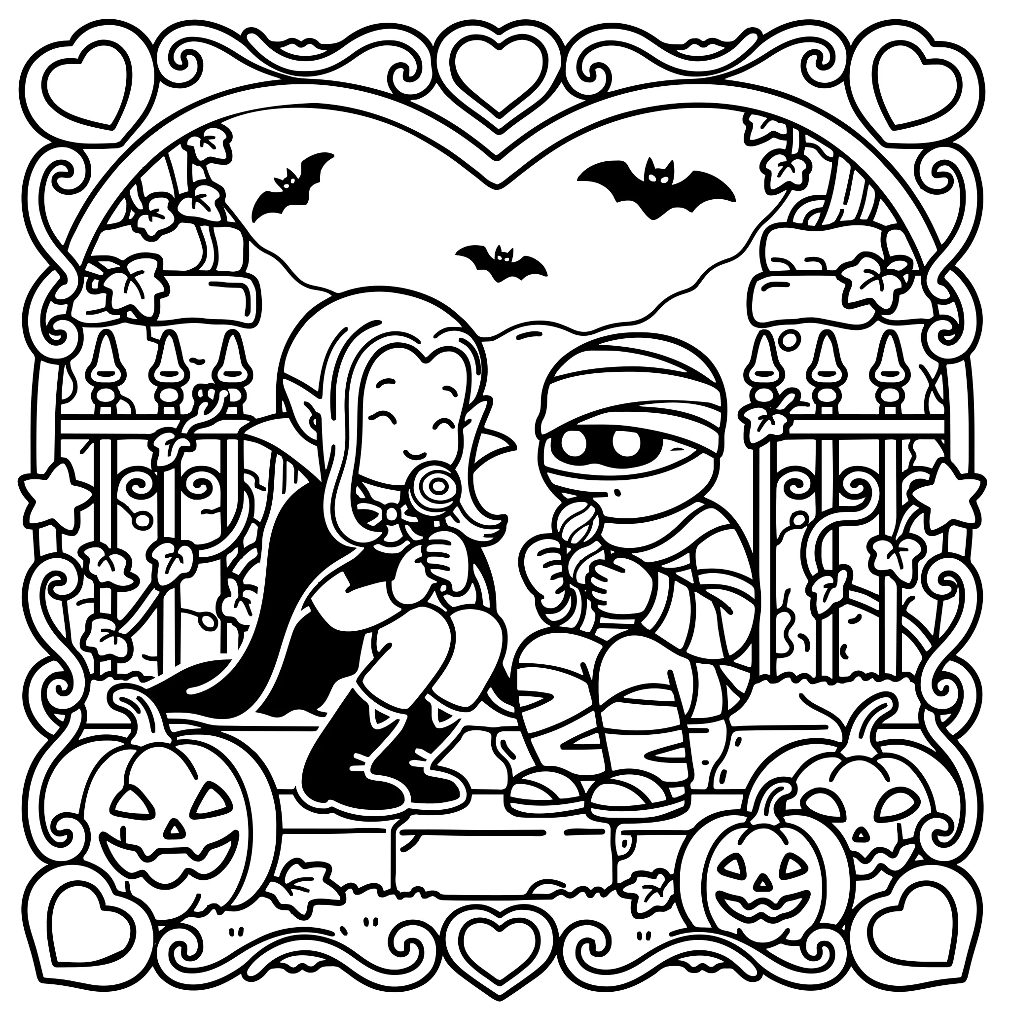 Vampire and mummy sharing sweets on old steps.